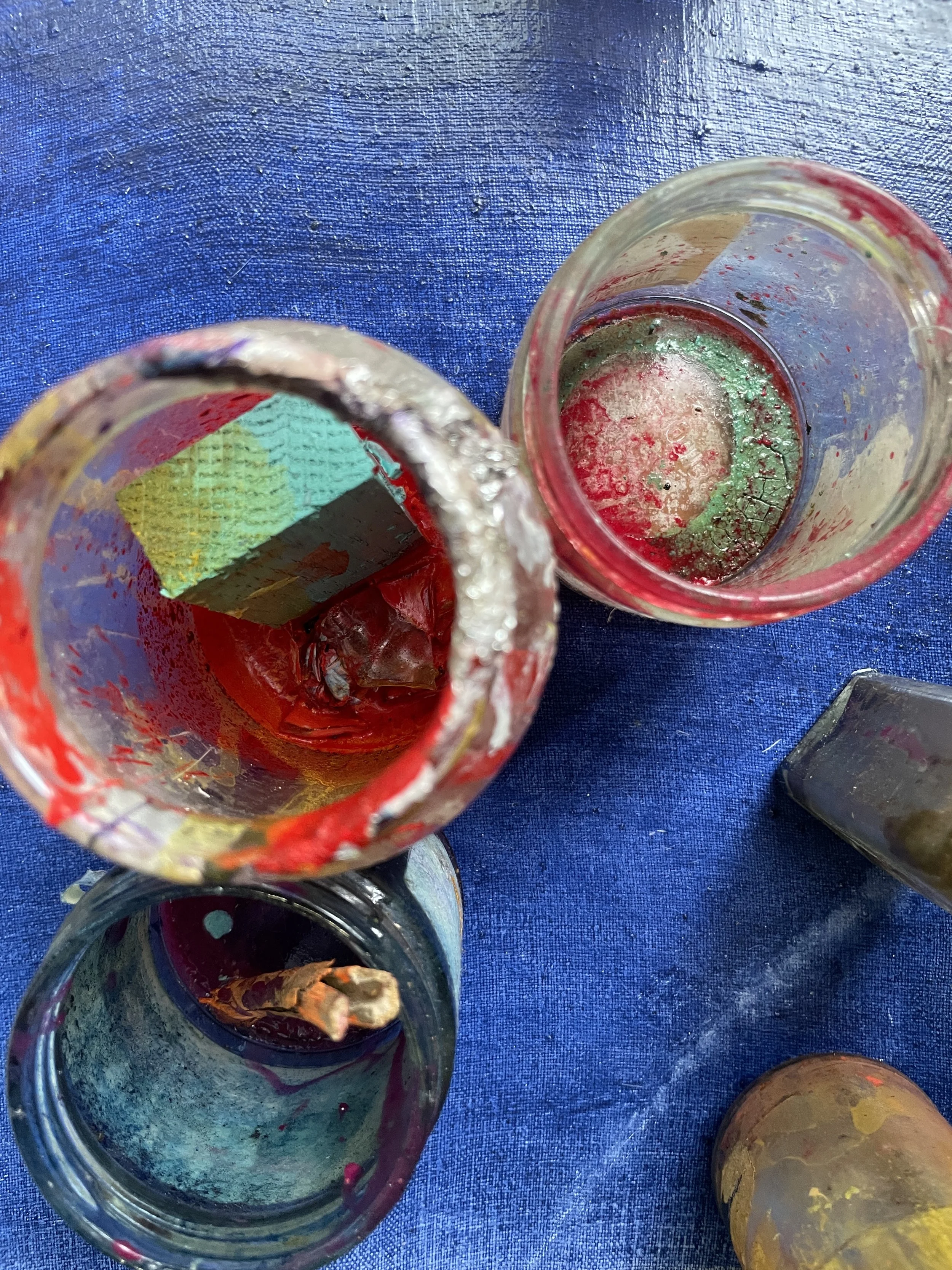 Bartender, 2025, 15.25"x15.25"x6.5", Oil, acrylic resin, acrylic, watercolor, epoxy, glass jars, plastic spoon, and other objects on linen on wood,